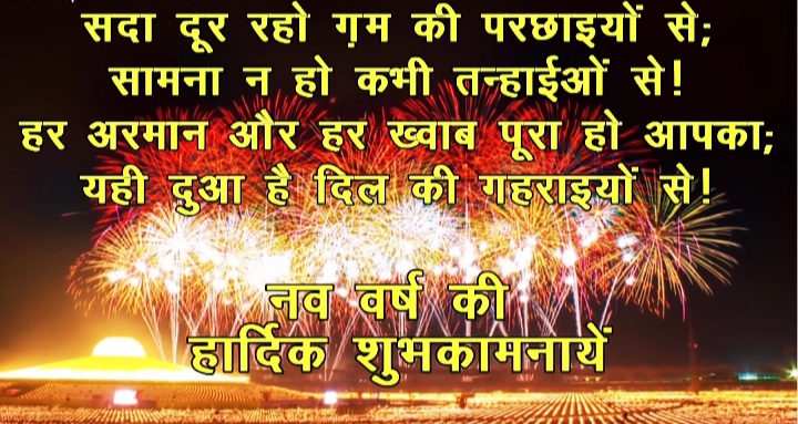सदा दूर रहो गम की परछाइयों से, सामना ना हो कभी तन्हाईयो से, हर अरमान और हर ख्वाब पुरा हो आपका, यही दुआ है दिल की गहरइयों से।। !! Happy New Year!!